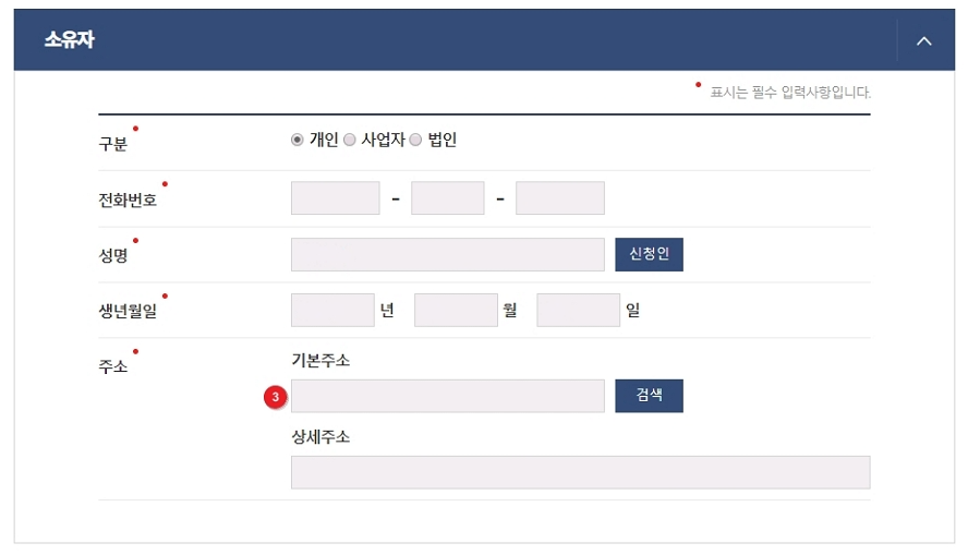 - ③ 신청인 버튼을 클릭하여 신청인의 기본정보를 자동입력