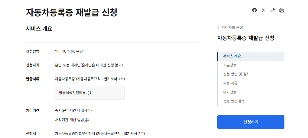 정부24 웹사이트에서 자동차등록증 재발급을 신청할 수 있습니다. 간편 인증 또는 공동인증서로 로그인 후 신청 가능합니다.